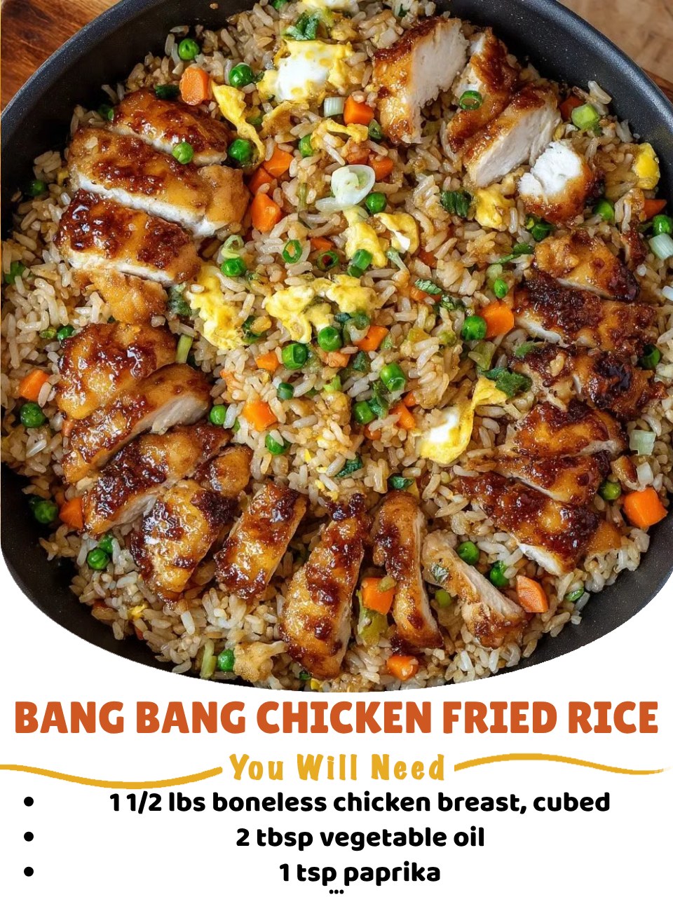 Bang Bang Chicken Fried Rice features golden, seasoned chicken coated in a creamy, sweet-spicy Bang Bang sauce. The chicken is paired with hearty fried rice full of colorful vegetables, scrambled eggs, and a touch of melted butter for extra richness. Day-old rice is recommended for the best texture, absorbing flavors and ensuring a satisfying bite. Topped with extra sauce and a sprinkling of green onions, this meal balances savory, tangy, and spicy notes, making it a vibrant centerpiece for any dinner table. Quick prep and bold flavors come together in this crowd-pleaser.