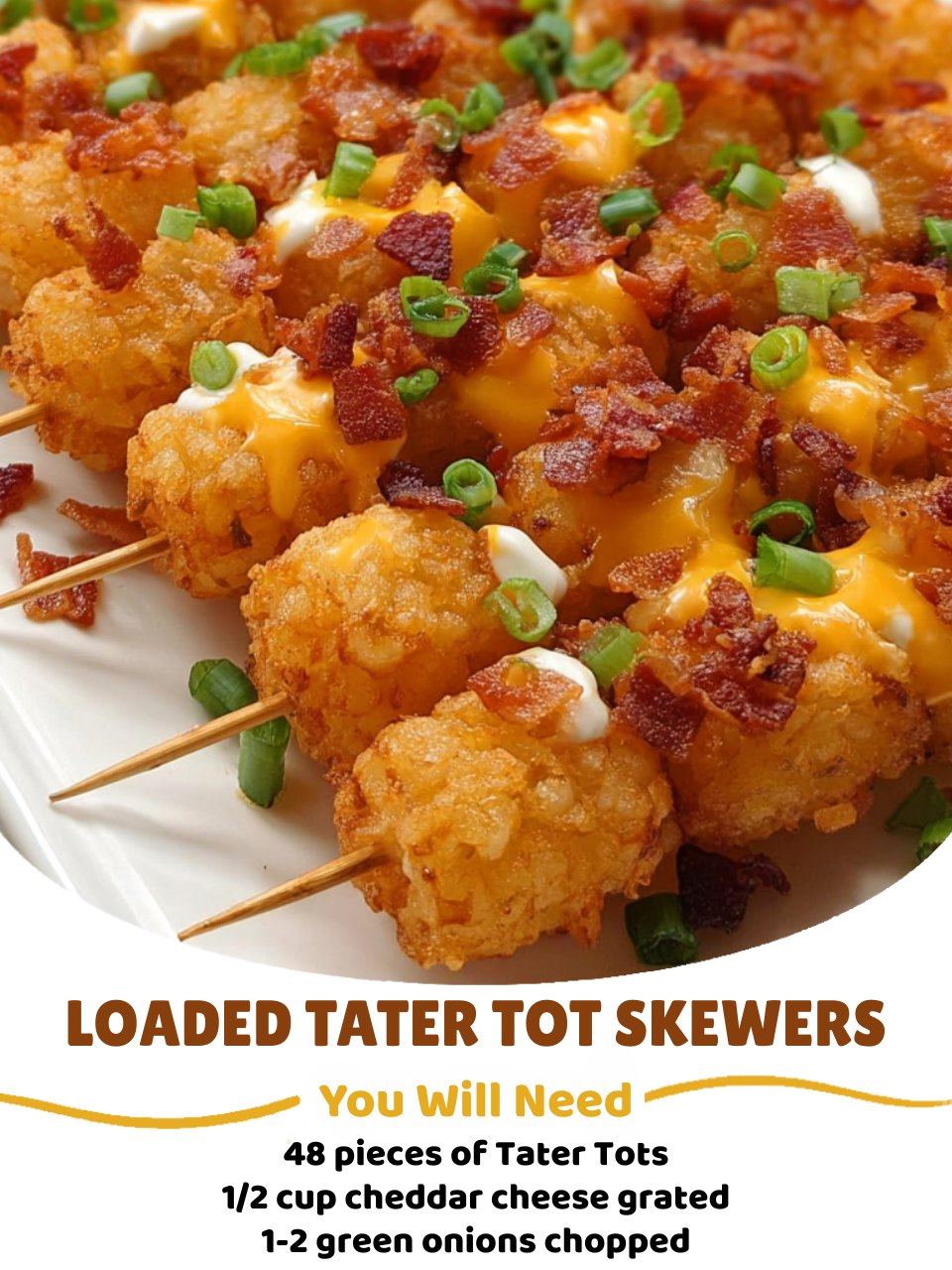 These loaded tater tot skewers deliver crispy goodness, combining tater tots, cheddar cheese, and real bacon bits for a rich, smoky bite. Each skewer is topped with fresh green onions and served hot, straight from the oven, for a flavorful finish. Easy assembly makes them perfect for parties or family gatherings. After baking, enjoy them with a generous dollop of sour cream to add a creamy contrast to the melted cheese and crunchy tots. This playful snack is simple, crowd-pleasing, and full of comforting flavors everyone will enjoy.