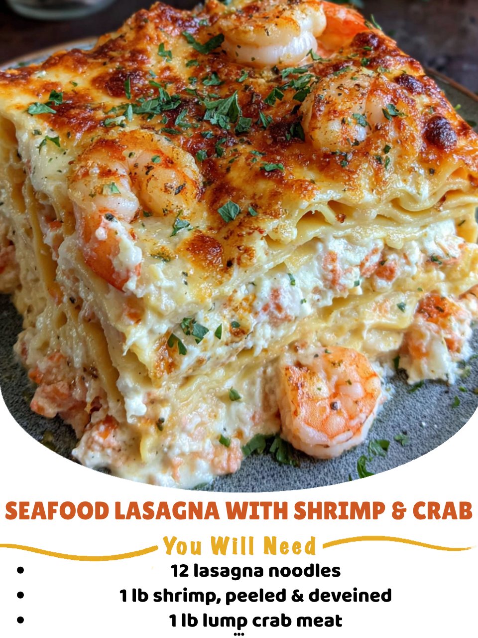 A seafood lasagna recipe with shrimp and cheese.