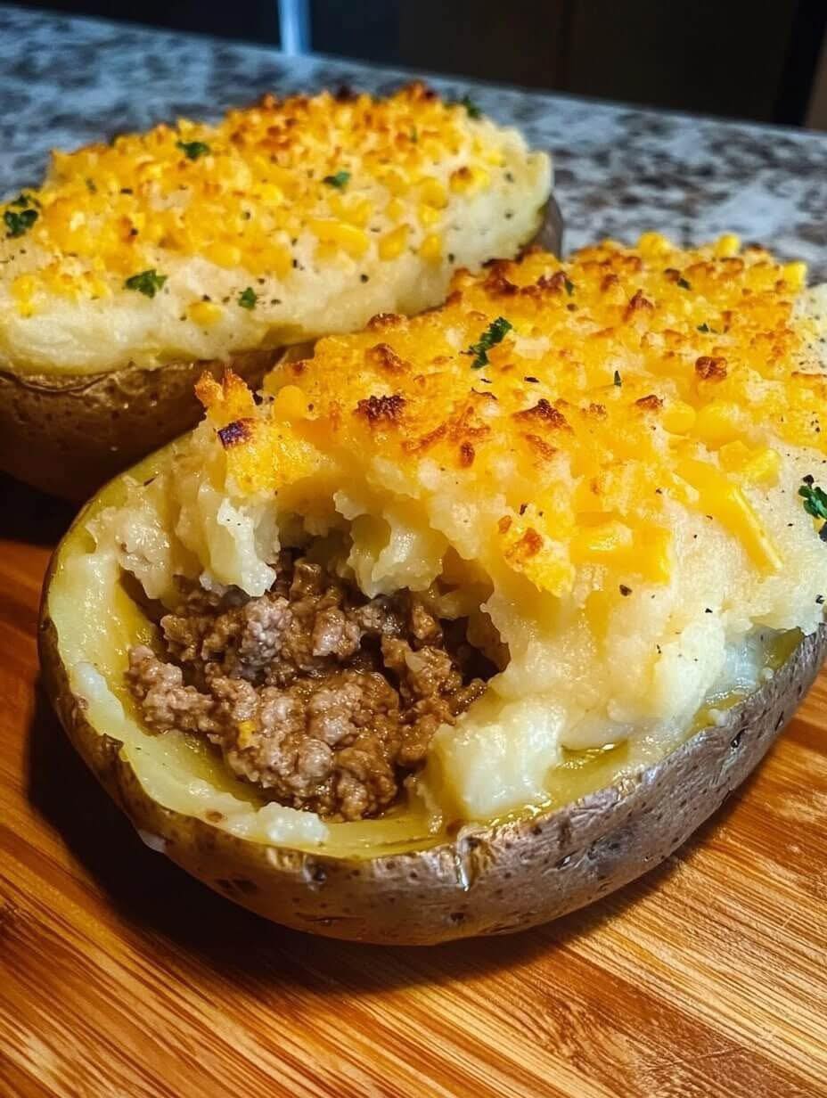 Fill Potato Shells: Spoon a generous amount of the prepared meat filling into each hollowed-out potato half.